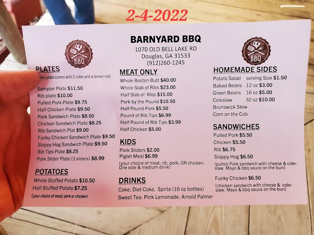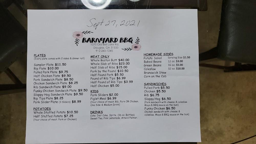 Welcome to BARNYARD BBQ, your go-to destination for mouthwatering barbecue in Douglas, GA! Nestled at 1070 Old Bell Lake Rd, our casual dining spot offers a relaxed atmosphere perfect for solo diners, families, and tourists alike. Enjoy a variety of local specialties, including tender ribs, savory pulled pork, and delicious kumpir. Sit back on our charming terrace or take advantage of our takeout and delivery services. With an extensive tea selection and a kid-friendly menu, there’s something for everyone. Join us for lunch or dinner and savor the taste of traditional barbecue in a welcoming setting.